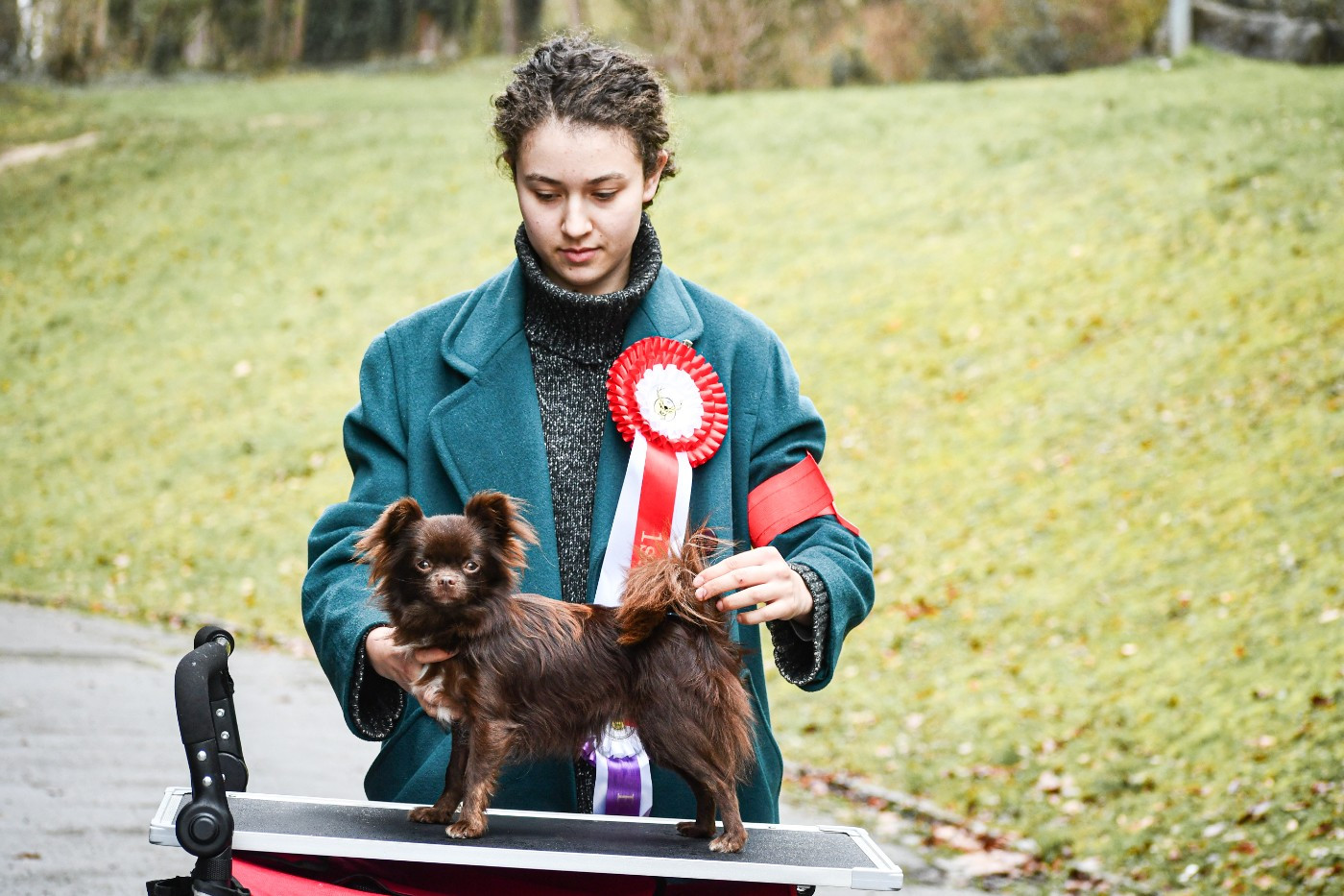 Mériterait un peu plus de front, oreilles bien insérées, oeil de bonne forme, excellent dessus, fouet bien inséré, côtes bien fermes, excellentes épaules et angulation des membres, bonne collerette, culotte et fouet bien fourni.