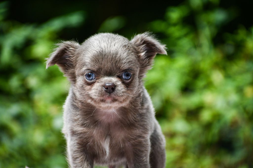 Femelle Chihuahua LOF poils longs de couleur lavande et tan née le 11 juin 2025, elle est la fille d'Ultimate Al Pacino des Pattounes Douces et Unity Violette des Pattounes Douces.
